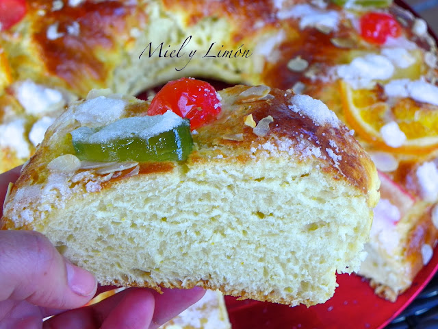 Nada mejor que un roscón de reyes para felicitaros las fiestas. Es una receta que queda muy esponjosa y tierna, nada que envidiar a los comprados. Eso sí, es una masa que se tiene que comer el mismo día, al día siguiente se endurece mucho y para mi gusto, no vale nada.