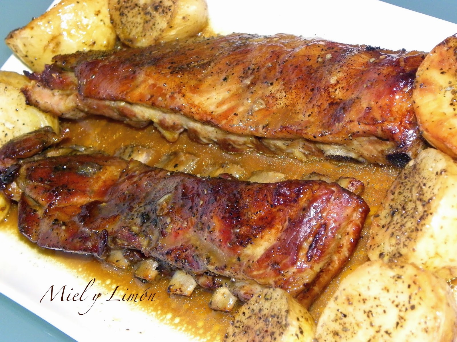 Vi esta receta por primera vez en el blog de mi amiga Nuria, Con tu pan de lo comas. Un blog con un recetario muy variado que siempre acompaña sus recetas con un paso a paso y un gran sentido del humor, donde podéis encontrar platos realmente exquisitos. Os recomiendo que os paséis a visitarlo, os encantará. En cuanto vi estas costillas, sabía que las iba a hacer porque me encantaron. Nuria las hace en sartén. Yo, como no tenía muchas ganas de cocinar (porque ya me había pasado toda la mañana en la cocina) y las quería dejar preparadas para comer al día siguiente, decidí meterlo todo al horno y arreando... El resultado,¡espectacular! Si no, probadlas y ya me contáis.